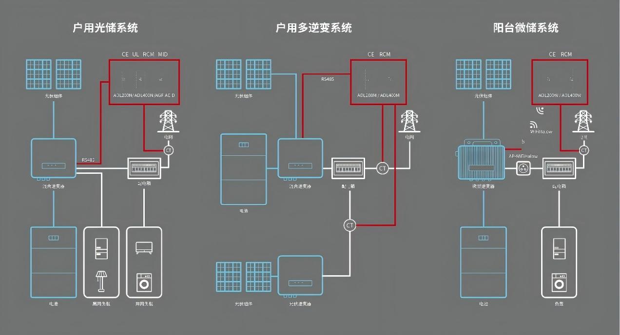 De rol van de Acrel Energy Meter in residentiële PV-systemen is anti-terugstroombewaking, waarbij voornamelijk de stroom-/vermogensomstandigheden op het punt van de netaansluiting worden bewaakt.
