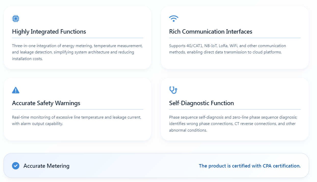 Voor hoge integratievereisten van alles-in-één ontwerpen voor omvormers voor energieopslag en vereisten voor tweekanaalsmeting in retrofitscenario's, zijn de instrumenten uitgerust met snelsluitklemmen voor spanning en stroom en RJ45-communicatiepoorten. Ze ondersteunen ook gegevensvernieuwingsfrequenties van 50 ms en aanpassing van de fasevolgorde, samen met een uitgebreid certificeringssysteem, waardoor ze geschikt zijn voor zowel retrofit- als nieuwe installatiescenario's.