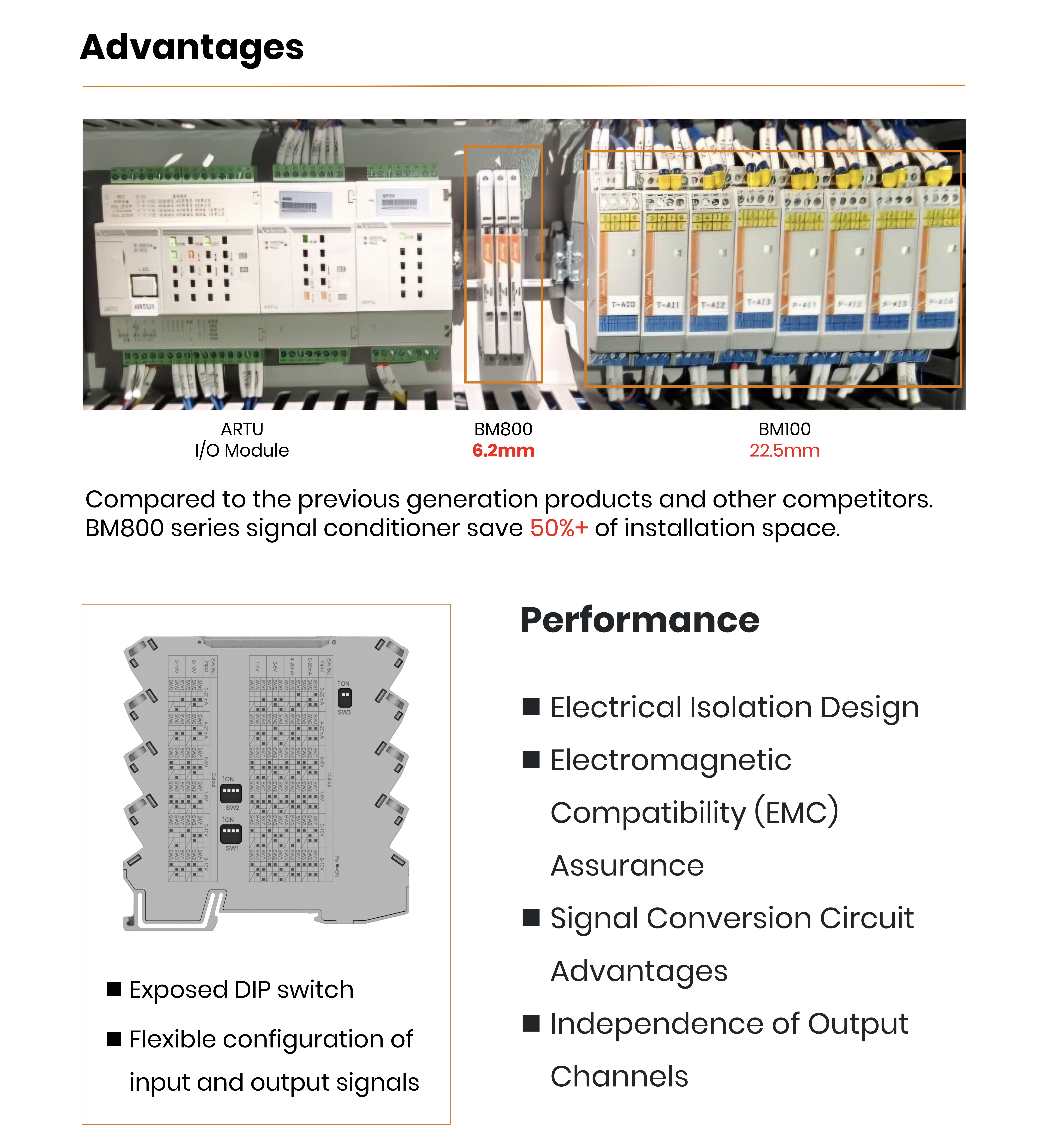 De signaalconditioner uit de BM800-serie, ook wel signaalisolatoren, signaalomvormers en signaaltransducers genoemd, is een geavanceerd industrieel signaalconditioneringsapparaat met een superdun ontwerp van 6,2 mm, waardoor meer dan 50% installatieruimte wordt bespaard. Het beschikt over een nauwkeurigheid van 0,1%, garantie op elektromagnetische compatibiliteit en functies zoals elektrische isolatie, signaalconversiecircuitvoordelen en onafhankelijke uitgangskanalen. Met een DIP-schakelaar voor flexibele invoer- en uitvoersignaalconfiguratie kan hij verschillende signalen verwerken, zoals 0/4~20mA, 0/1~5V, enz. Hij levert ook uitstekende prestaties op het gebied van temperatuurafwijking, responstijd en isolatiesterkte.
